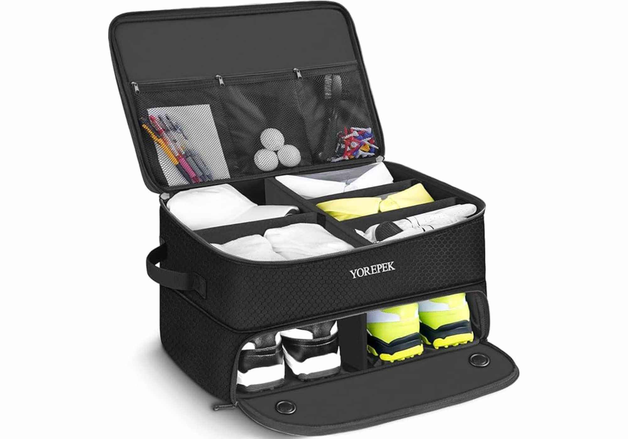 This trunk organizer from Amazon has a place for nearly every golf accessory you can think of. Two pairs of shoes (up to size 11)? No problem. The shoe compartment is separated and ventilated to help your shoes breathe while stored. Tees, gloves, golf balls, a couple of hats and towels? You’re covered. This organizer will keep everything you need organized and together so you don’t have to scramble to find your gear when you’re cutting it close for that tee time.