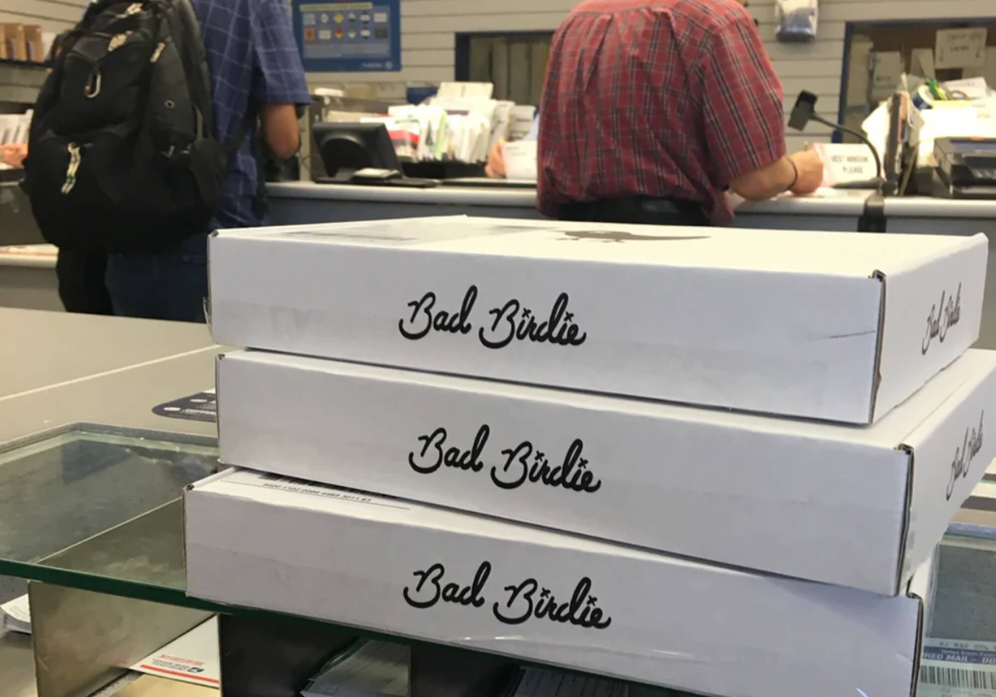 The first Bad Birdie orders at the Post Office, ready to go.