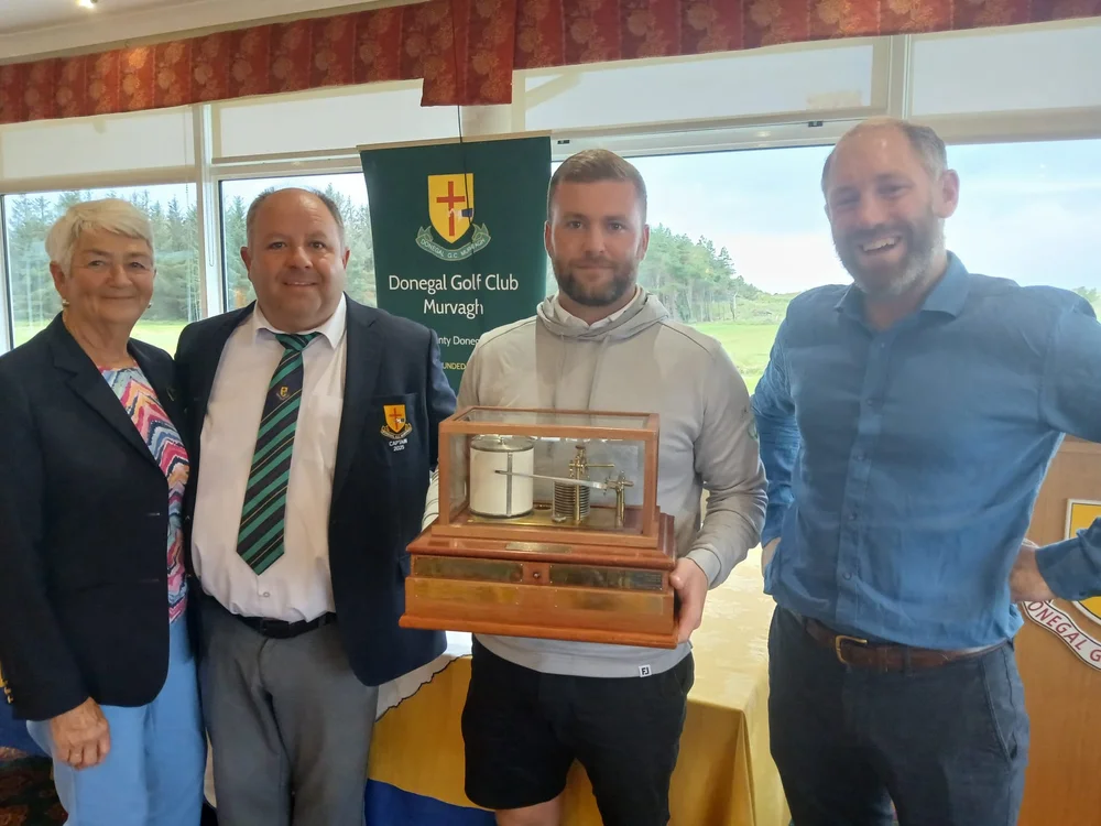<p>Dwayne Mallon (Dungamnon Golf Club) being presented the Magee 1866 Scratch Cup by Patrick Temple (Magee1866). Also pictured are Lady Captain Ger Giblin. and Captain Darren McDaid.</p>