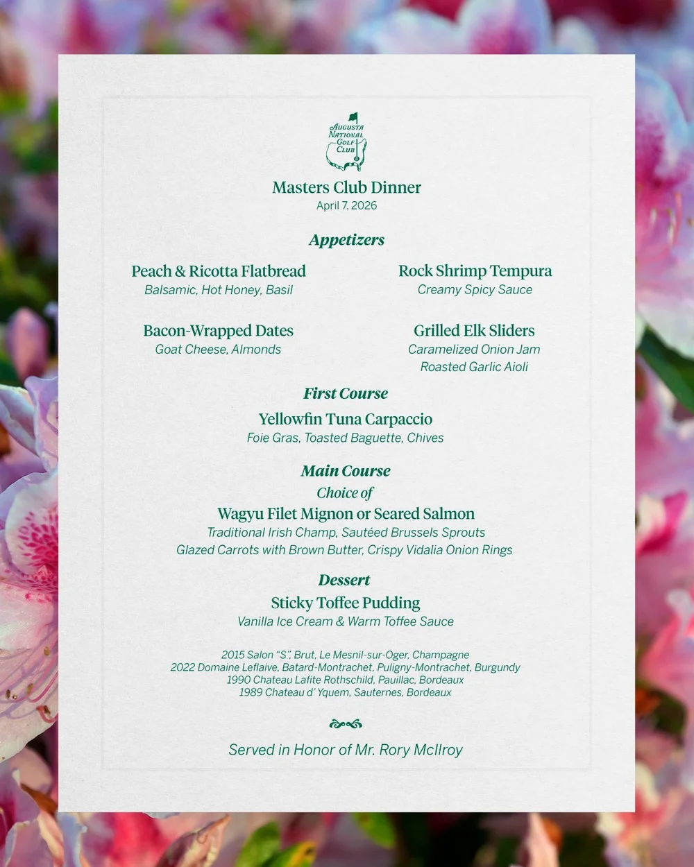 Wine will come from the Augusta National wine cellar with a little inspiration from Shane Lowry, who bought him a case of wine from Augusta National’s wine cellar (at $1,200 a bottle approx.) the evening of his Masters triumph.