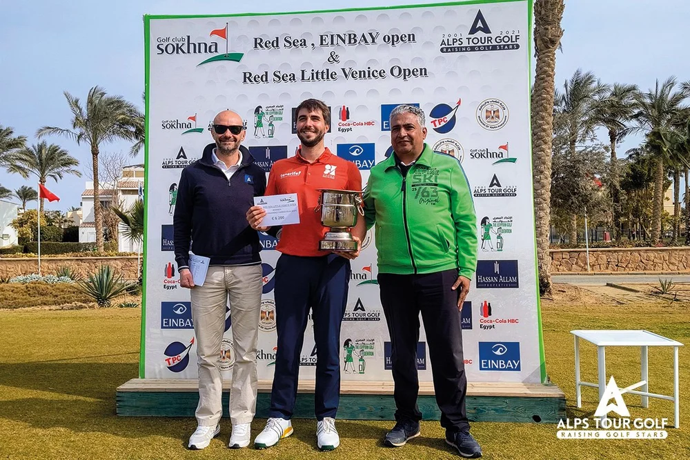 <p>Alessandro Pia (Deputy Director of Tour Operations and Tournament Director); Alvaro Hernandez Cabezuela (winner Red Sea Little Venice Open); Ali Mohamed (Sokhna Golf Club Director). Photo: Alps Tour Golf</p>