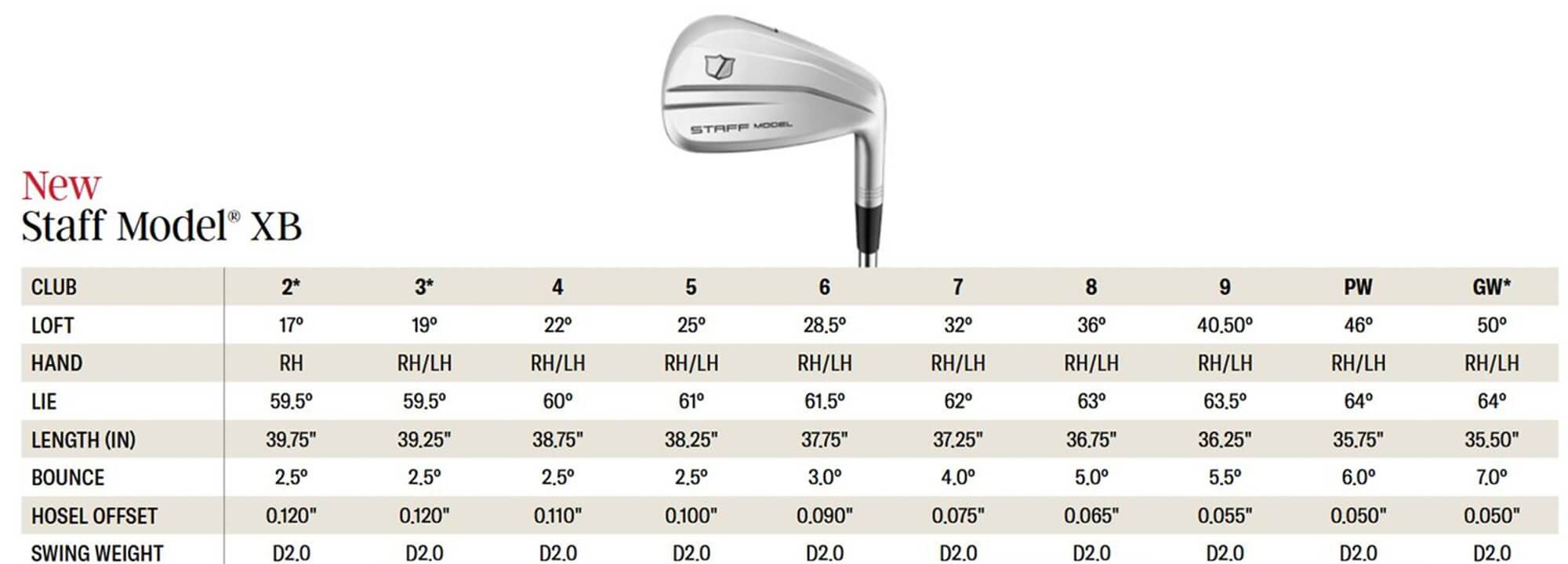 The Staff Model XB is available in a 3-iron through gap wedge for both lefties and righties. The 17-degree 2-iron comes in right-handed only.