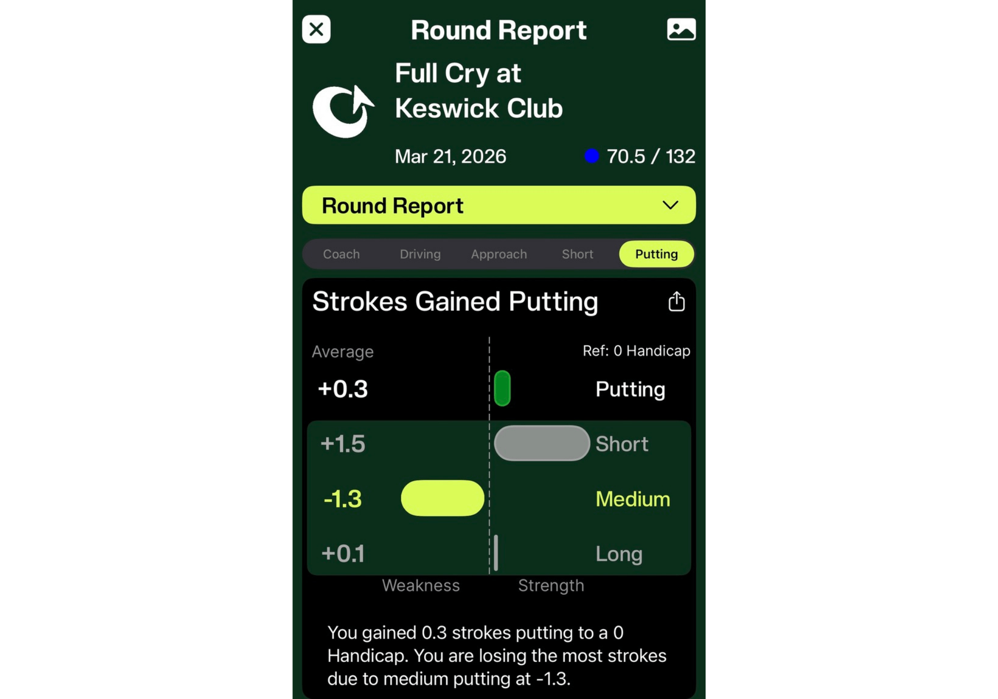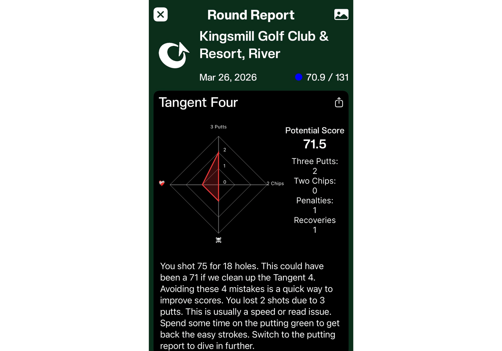 When you finish a round, the “Round Report” is where Tangent really shows its cards: Strokes Gained broken down across driving, approach, short game, putting. Sub-categories within each. A spider graph called the “Tangent Four” flagging your biggest problem areas: three-putts, two-chip sequences, recovery shots, penalties.