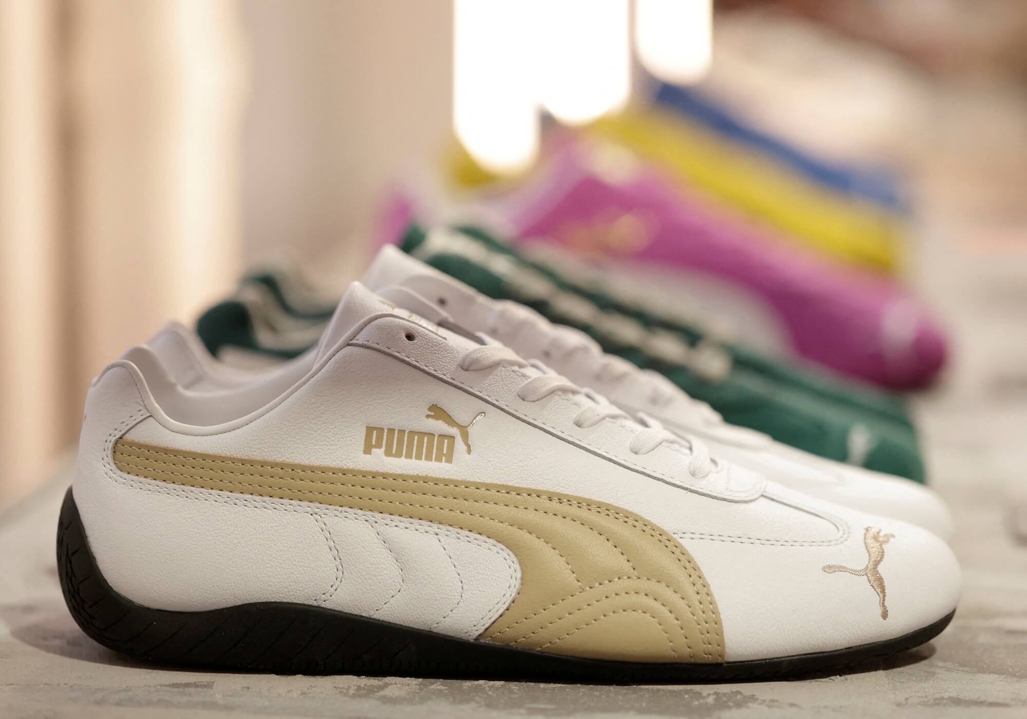 FILE PHOTO: Puma Speedcat OG sneakers are displayed at the Puma Mostro House in Paris, France, January 24, 2025. REUTERS/Abdul Saboor/File Photo